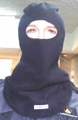 Este modelo de balaclava o pasamontañas se diseñó como una capa inicial para proteger la cabeza, cara, oídos, nariz y cuello, del frío intenso, de la nieve, y rayos solares.
